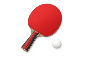 Table tennis racket and ball for playing ping pong, sport equipment with red paddle on transparent background
