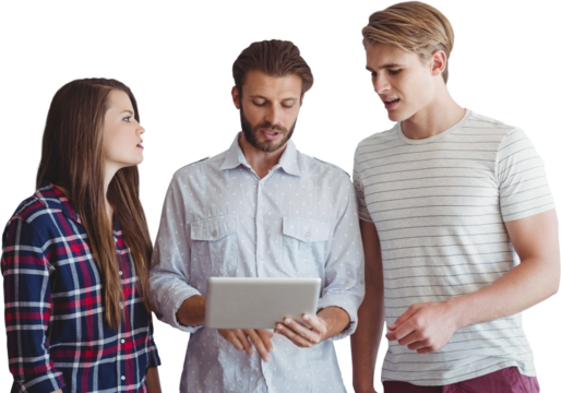 Dynamic creative team collaborating on tablet in casual office, transparent background