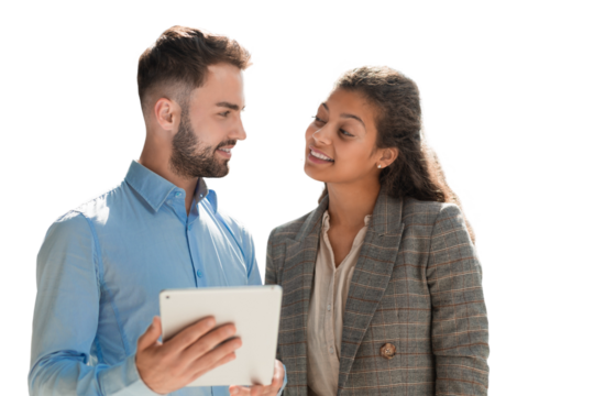 Group of young modern people in formalwear smiling and discussing something while working on a transparent background