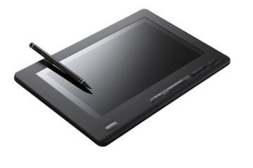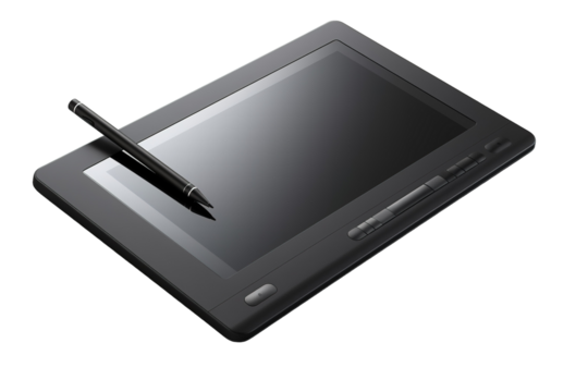 A Black Stylus Pen Resting on a Sleek Digital Drawing Tablet on a Clear PNG or White Background.