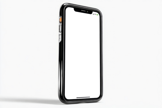 A black iPhone with a white case sits on a white background. PNG transparency.