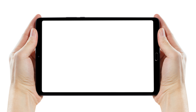 Hands holding black tablet computer cut out