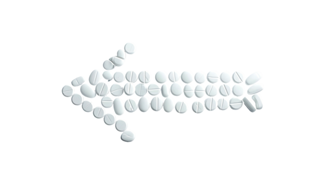 A white arrow made from pills, pointing left on a black background, representing medical direction