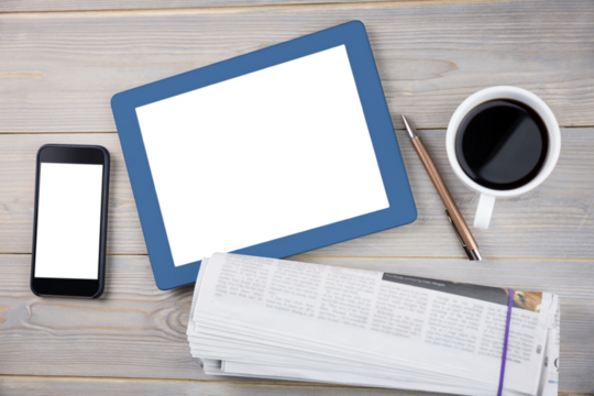 Digital png illustration of smartphone and tablets on wood on transparent background