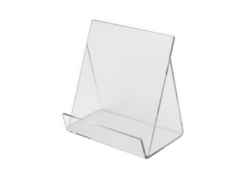 Clear acrylic easel stand display holder for photos or signs isolated on transparent background