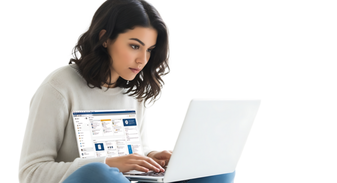 Focused young professional works diligently on her computer, tackling a project with unwavering determination and skill.