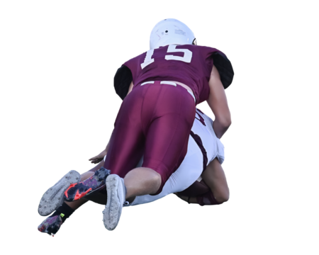 Dynamic action pose of two football player doing sliding tackle on isolated background