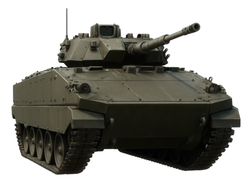 Armored infantry vehicle with angled front armor and protective side skirts.