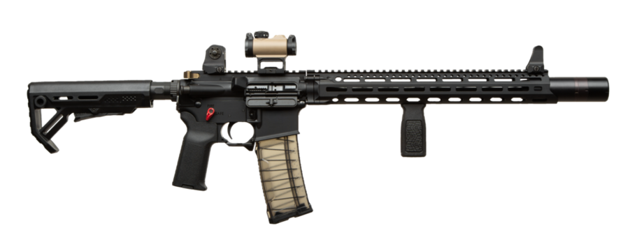 Modern tactical rifle with scope, vertical grip, and suppressor, isolated on transparent background.