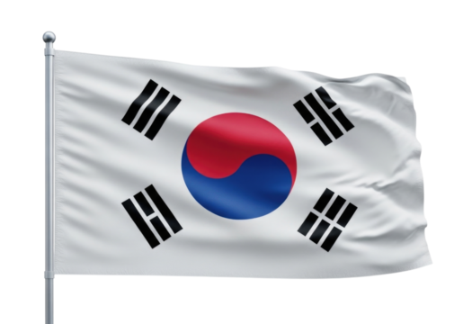 The south korean flag, featuring the taegeuk symbol and trigrams, waves on a flagpole isolated on transparent background