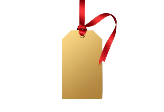 A red ribbon with a bow and a blank golden gift tag, a decorative element for holiday presents and sale promotions for Christmas. Transparent Background, Cutout