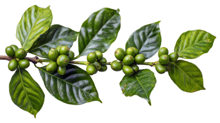Close-up of green coffee plant branch featuring leaves and coffee cherries, ideal for agricultural and botanical themes.