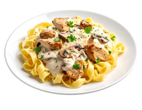 A plate of tagliatelle pasta topped with creamy mushroom sauce, grilled chicken pieces, and garnished with fresh parsley isolated on transparent background.
