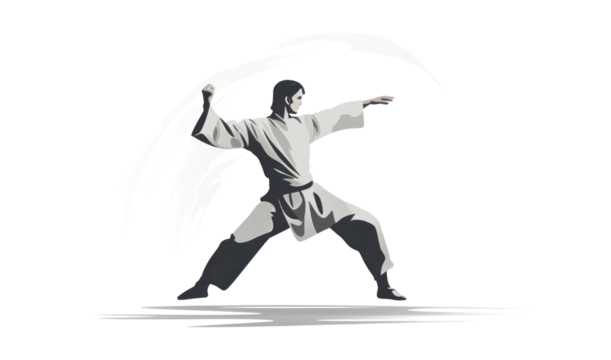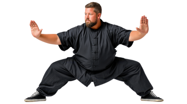 Serene Martial Art: A man practices the ancient art of Tai Chi, a peaceful, low-impact martial art, with open arms. Experience the internal peace of Qigong meditation, promoting holistic health.