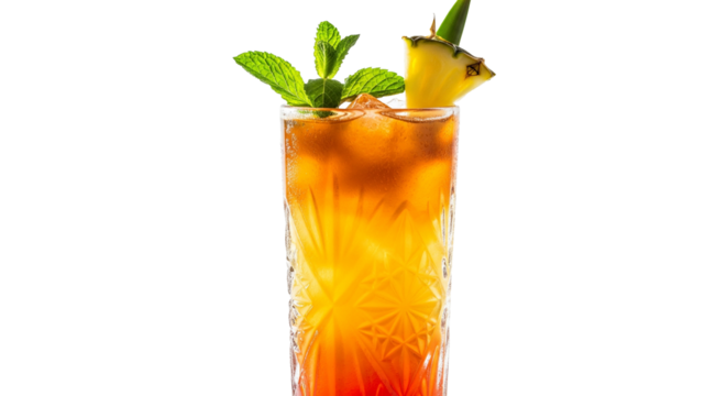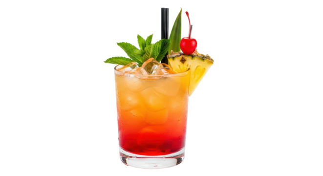 A tropical mai tai cocktail with a pineapple slice and cherry garnish, served in a tall glass, Transparent background, PNG file
