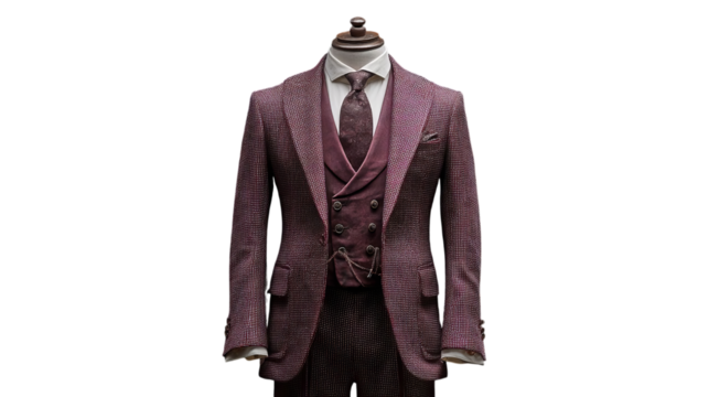 PNG of Elegant men's formal attire featuring a rich burgundy suit with a tailored vest and silk tie.