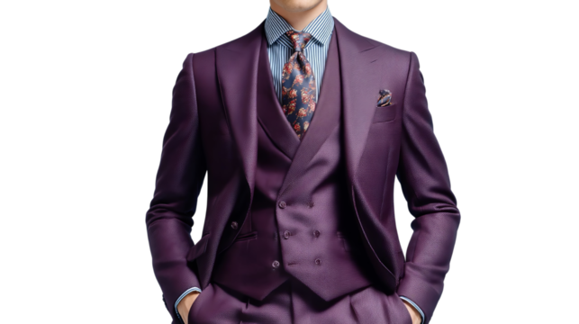 PNG of Elegant purple formal suit featuring intricate patterns and tailored fit, perfect for special occasions and celebrations.