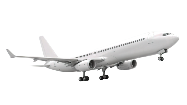 Realistic high-detailed white jet airliner taking off, isolated on a transparent background. Perfect for travel, aviation, airline services, global transportation, or business flight-themed visuals.