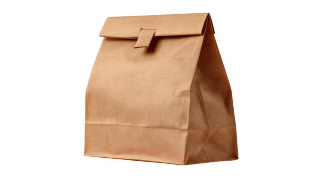 A clean, high-resolution image of a brown paper lunch bag with a neatly folded top, isolated on a transparent background (PNG), ideal for eco-friendly packaging designs, product mockups, food delivery