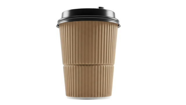 Brown paper coffee cup with black lid isolated PNG, disposable takeaway drink container for hot beverages on transparent background