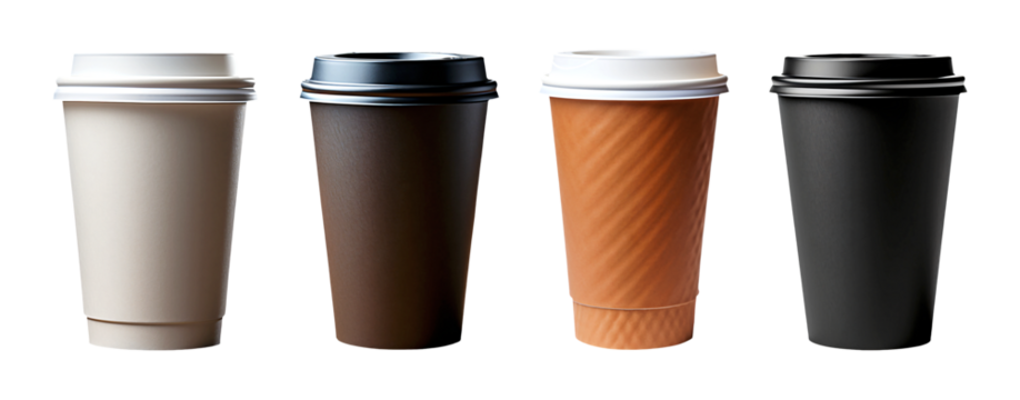 Four takeaway coffee cups in different colors and textures with lids isolated on a transparent background