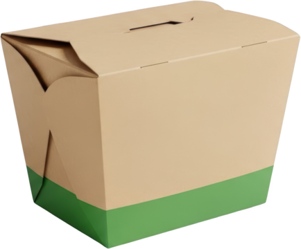 A closed upright rectangular take out container constructed of brown kraft paperboard with a horizontal green band along the base isolate takeout food
