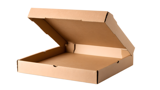 Close up of a square corrugated cardboard pizza box open and empty on white background with natural light