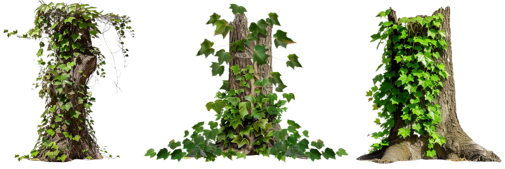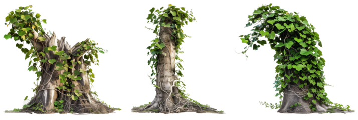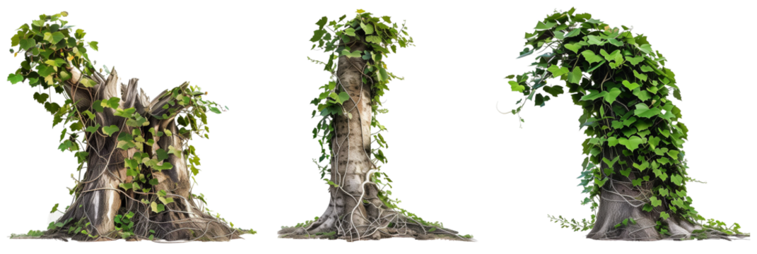 set of tree trunks covered with ivy, depicting the gradual takeover by creeping vines, isolated on transparent background