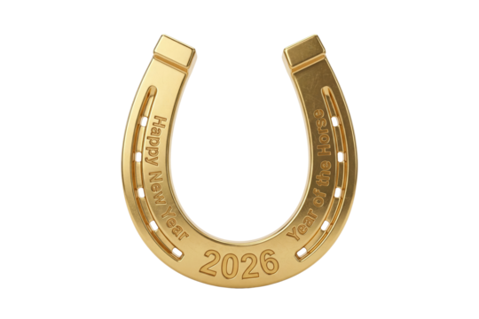 golden horseshoe 2026, Chinese New Year, lucky charm with engraved text 3d illustration