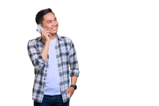 Smiling young Asian man in plaid shirt talking on mobile phone, looking aside at copy space isolated on transparent background