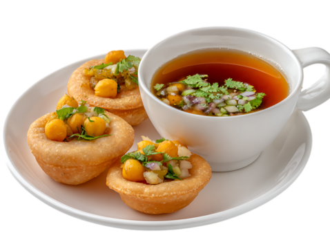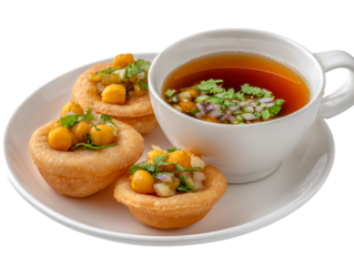 Delicious north and south indian street food pani puri gol gappa with tamarind water served in white plate and potato and chickpeas for food on white background