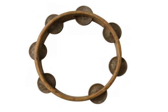 Tambourine with wood frame and metal jingles, a traditional percussion instrument for music and rhythm on transparent background