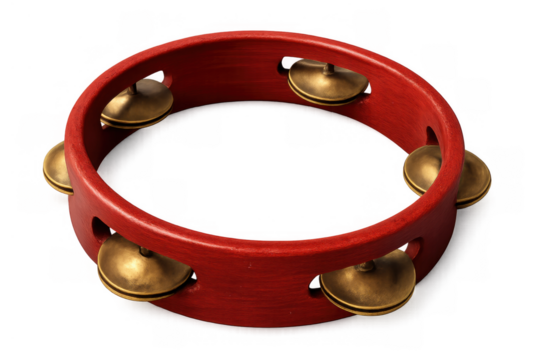 Tambourine, a red wooden percussion instrument with jingles, creating music and rhythm. Transparent background for easy use