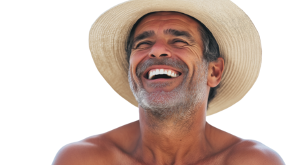 Middle-aged man with visible tan lines, laughing, wearing beachwear, isolated PNG