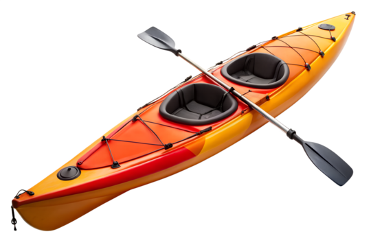 A vibrant orange and yellow tandem kayak with paddles, isolated on transparent background, ready for a water adventure with a friend or partner