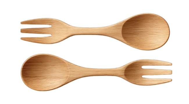 Two wooden eating utensils, a spoon and fork, displayed in tandem