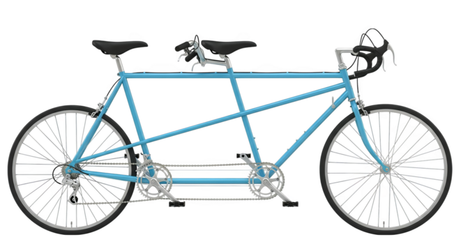 A light blue tandem bicycle is ready for a pair of riders to enjoy a pleasant outdoor adventure.