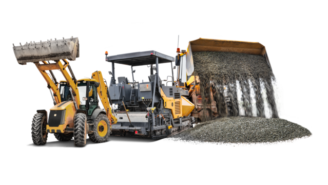 Heavy construction equipment including a bulldozer, paver, and loader work in tandem to lay asphalt. The machines efficiently move materials for road building.