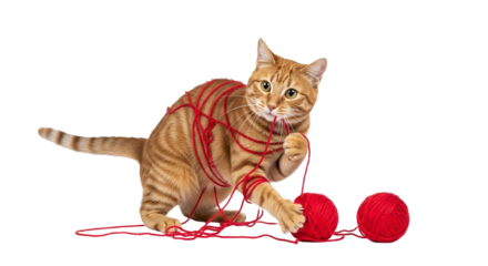 Adorable ginger cat tangled in vibrant red yarn, playfully batting at yarn balls on a white backdrop