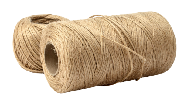 Close-up of two natural-toned spools of twine, one upright and the other on its side