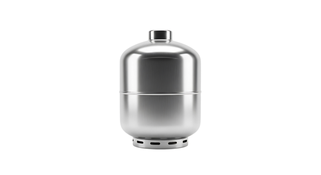 Polished silver metallic propane gas tank cylinder with a valve on top, isolated on transparent background