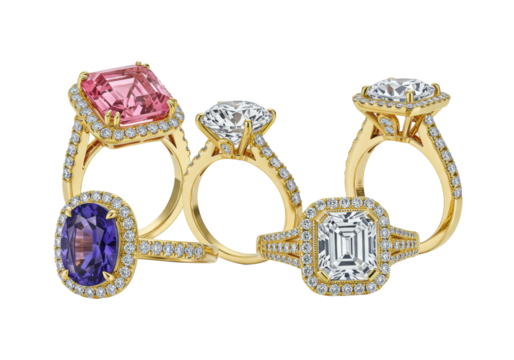 Four opulent diamond and gemstone rings (pink, purple) with yellow precious metal bands on a reflective white surface, transparent background, macro shot, high-end luxury jewelry display