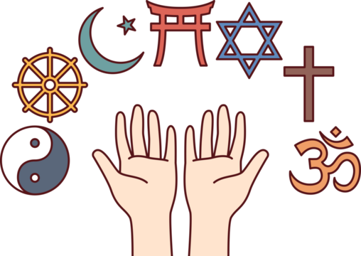 Symbols of religions and confessions near hands of person choosing best religion for worship