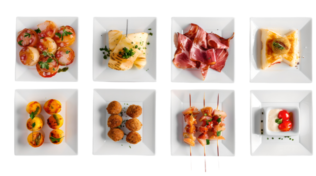 A vibrant spread of assorted tapas featuring meats, seafood, cheeses, and olives, set against a neutral background