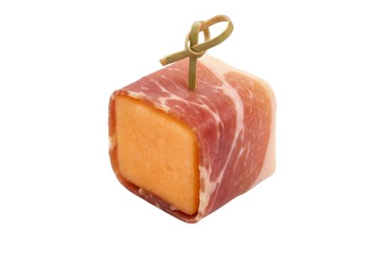 Prosciutto wrapped melon cube appetizer with bamboo skewer