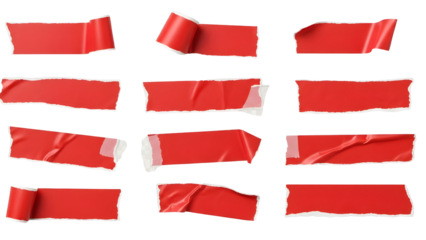 Collection of vibrant red adhesive tape strips isolated against a dark background showcasing various textures and forms