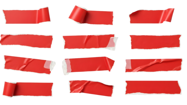 Red Tape Strips: A collection of vividly red tape strips, each piece showcasing its own unique shape and texture, exuding a sense of organized chaos. Capturing the essence of detail and design.