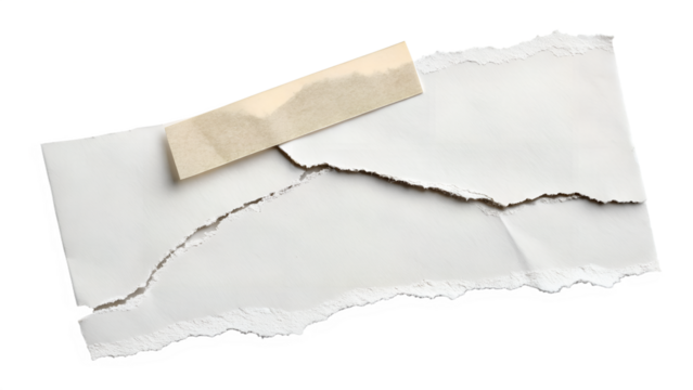 Roughly torn white paper fragments are layered and taped with a beige strip, professionally isolated for transparent background designs.