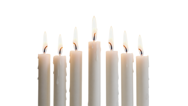Set of seven glowing candles arranged in different heights, showcasing warm light against a transparent background for a calming atmosphere