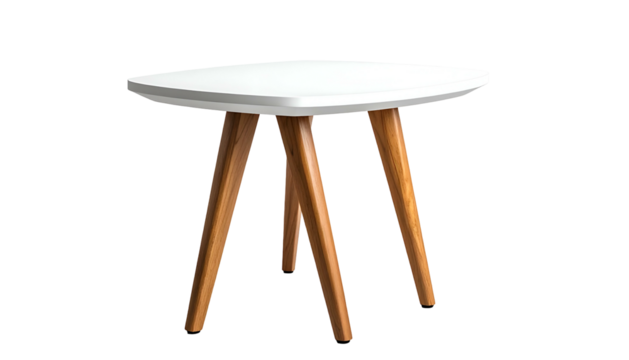 A modern side table featuring a white triangular top and three wooden tapered legs